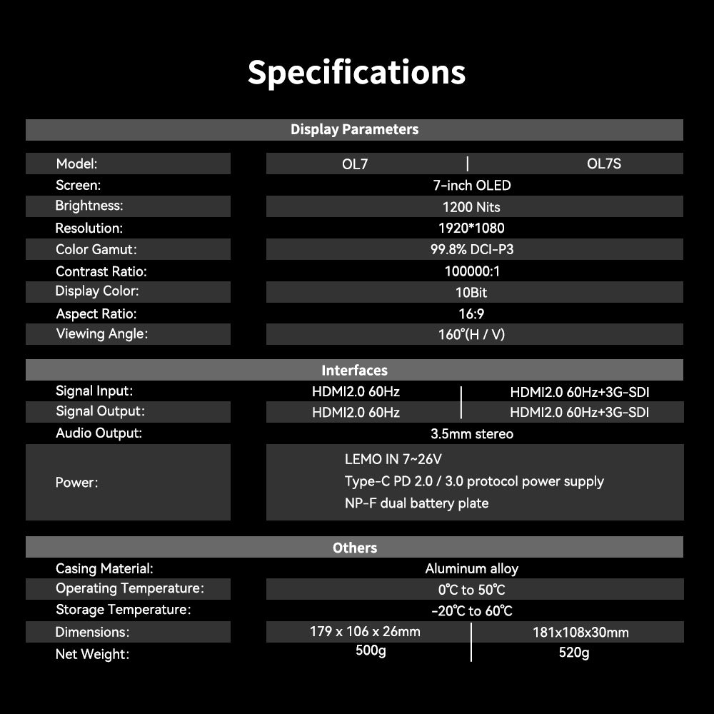 Encased in a durable aluminum alloy housing, the OL7 is lightweight yet robust, built to withstand the rigors of on-set production. Whether you're shooting in the studio or on location, this monitor provides exceptional performance, accurate monitoring, and professional-grade durability.
