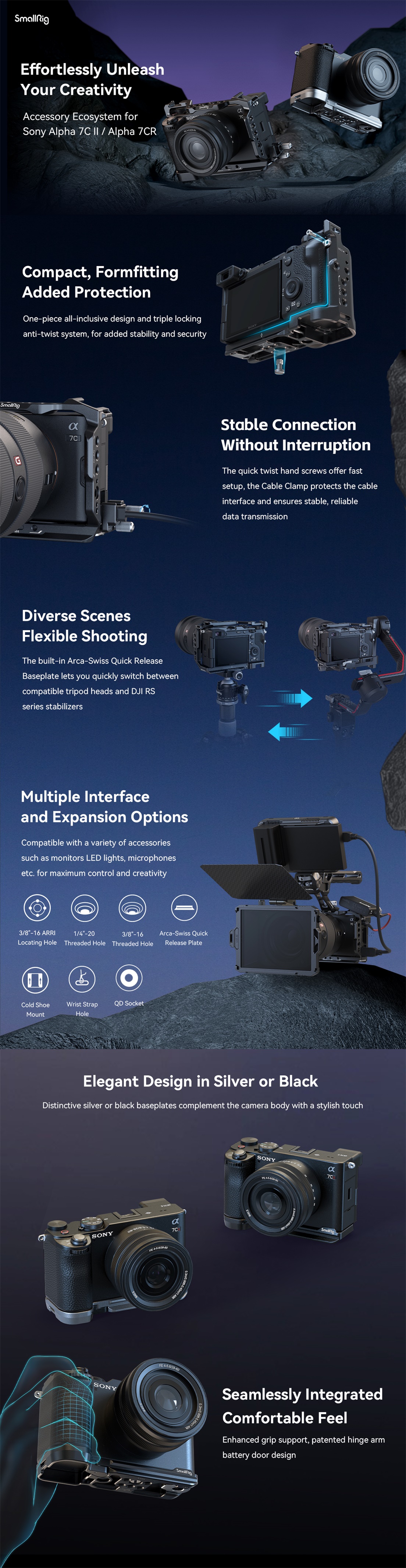 SmallRig Cage Kit for Sony Alpha 7C II / Alpha 7CR 4422 is designed to attach accessories and protect the camera and HDMI port. It includes a cage and a HDMI cable clamp. The cage secures the camera firm via one 1/4"-20 screw on the bottom and one M2.5 screw on the right side, with built-in cushions preventing scratches. Its hinge arm at the battery door better fits the camera curve and leaves room for the pinkie for more comfort. The HDMI cable clamp quickly attaches to the left side of the cage by using a thumb screw, protecting the HDMI port to ensure stable transmission. Comes with multiple mounting points for attaching accessories, including 1/4"-20 threaded holes and ARRI 3/8"-16 locating holes for Top Handle 3765, Side Handle 2913; one top ARRI 3/8"-16 locating hole for Monitor Mount 2903B; cold shoes for microphone, LED video light; a NATO rail for Rotating NATO Handle (Left Side) 3260; Built-in M4 threaded holes on the bottom front, compatible with Horizontal-to-Vertical Mount Plate 4424, realizing fast switching between vertical and horizontal shooting; and a bottom QD socket for mounting shoulder straps. The Arca Swiss quick-release plate on the bottom supports DJI RS 2 / RSC 2 / RS 3 / RS 3 Pro gimbals as well as DJI RS 2 / RSC 2 gimbals’ quick-release plate and Arca-Type Quick Release Plate 3154. The cage also reserves holes on both sides and the bottom for attaching accessories like Hand Strap 3848, Shoulder Strap PSC2428, etc. Besides, a magnetic Allen wrench is included for easy disassembly and assembly.