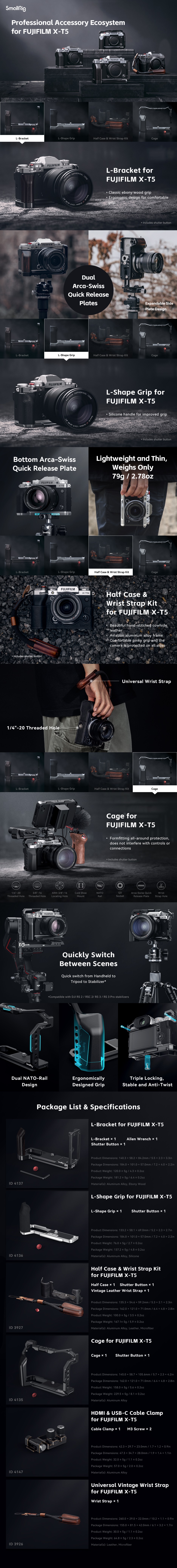 SmallRig L-Bracket for FUJIFILM X-T5 4137 is designed to facilitate the switch between horizontal and vertical modes and to improve grip experience. It locks the camera via one 1/4"-20 screw and one locating pin at the bottom, with rubber pads preventing scratches, and gives full access to buttons, card slots, battery door, and flip screen. Apart from a built-in blackwood grip for an enhanced grip experience, the plate also has various accessory mounts. At its bottom there is an Arca-Swiss quick-release plate for Arca-Swiss tripods and DJI RS 2 / RSC 2 / RS 3 / RS 3 Pro gimbals, 1/4"-20 threaded holes, and 3/8"-16 threaded holes that support Manfrotto-type plate 1280 or Side Handle 2093 for a handheld vertical shot.
