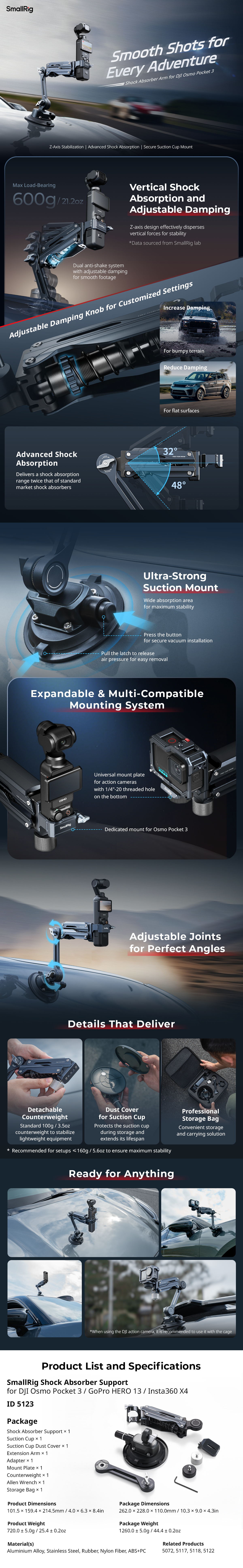 The arm is equipped with a damping adjustment knob to adapt to varying road conditions, making it suitable for challenging shooting environments. It includes a 4-inch manual vacuum suction cup that supports devices weighing up to 600g / 1.33lb, covering most mainstream action cameras. The suction cup comes with a dust cover to protect against scratches and extend its lifespan. Additionally, it includes a hard storage case for secure storage and easy portability.