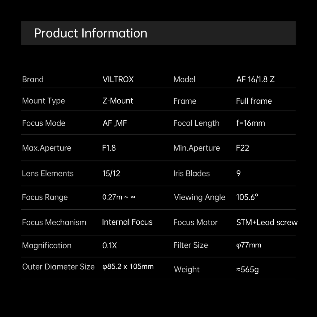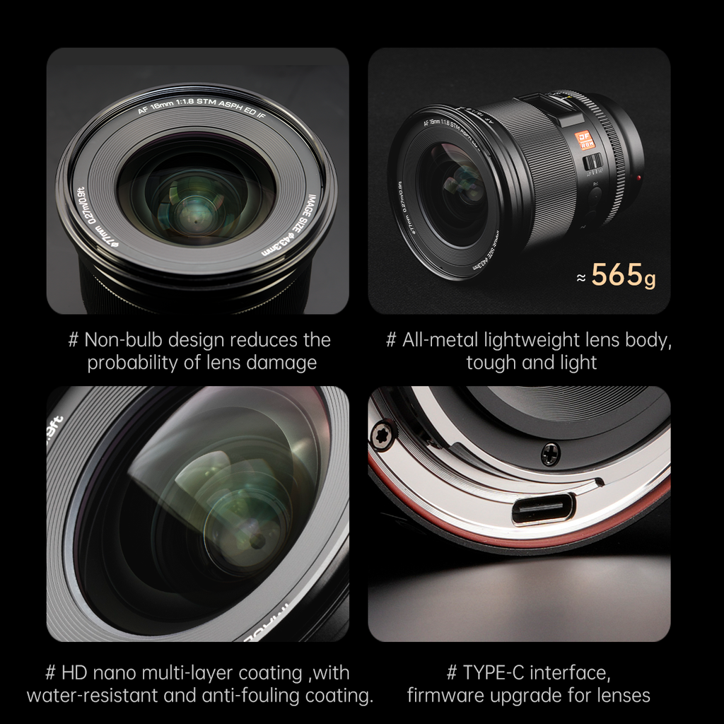 AF 16mm F1.8 Z has the unique advantages of Landscape/Astrophotography, full-frame high-definition and high-quality images. 3 aspherical lenses to accurately reproduce point light sources, and effectively suppress coma. The 16mm F1.8 lens features the advantage of creating Landscape/Astrophotography, as it can accurately reproduce point light sources and effectively suppress chromatic aberration.
