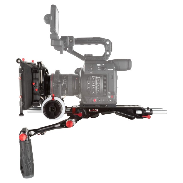 The shoulder pad secures on by touch fasteners. The tripod mount threads are located underneath the shoulder pad. Two pairs of 8″ and 4″ 15 mm rods are included for the front and back. For attaching a matte-box and other accessories, the rod adapter can be adjusted vertically if you remove the screw holding it in position. This baseplate also supports optional SHAPE 15 mm Studio and 19 mm Studio adapters in place of the included one. The baseplate features three camera mount slots, all supporting 1/4″-20 and 3/8″-16 screws. The off-center slots allow you to mount your camera offset if you use a 15 mm Studio Adapter. Multiple 1/4″-20 and 3/8″-16 mounting threads are peppered behind the three slots for attaching articulating arms and other accessories. Two 1/4″-20 and two 3/8″-16 camera mount screws are included.