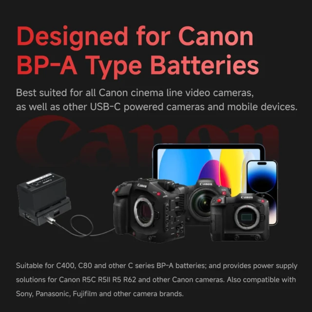 Beyond Canon systems, this BP-A battery plate is also compatible with Sony, Panasonic, Fujifilm, and other camera brands via its multiple output options. Designed to deliver equivalent voltage output to a V-mount battery, it provides robust power for cameras and accessories in a compact and lightweight form factor.