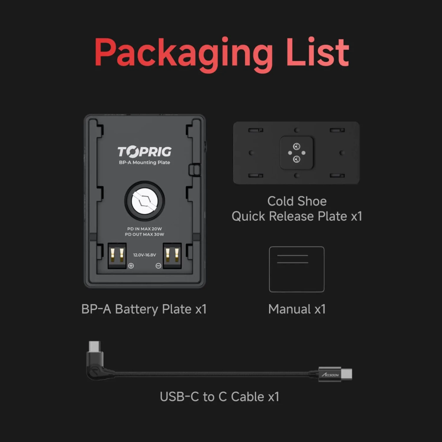 The Accsoon ACC-BC-08 TopRig BP-A Battery Plate is a compact and versatile power solution designed for Canon BP-A batteries, delivering up to 60W combined output to power cinema cameras, mirrorless cameras, and mobile devices.