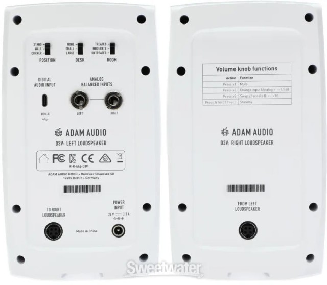 Equipped with a USB-C input and two balanced TRS sockets, D3V offers high-quality digital and analogue connections. Streamlined controls include a multi-function volume knob, intuitive room compensation switches and a multi-color status indicator. The D3V comes complete with detachable monitor stands as well as in-built threaded mic stand mounting points (3/8″) for perfect positioning in any environment.