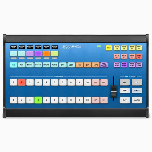 Perfect choice where cost matters but SKAARHOJ quality needs to be preserved. Dedicated Program/Preview, clearly labeled menus and ancillary buttons. Durable fader to keep transitions state-of-art. Air Fly is available with 3 different label layouts – for ATEM, for vMix and for TriCaster; using system-specific naming for each.