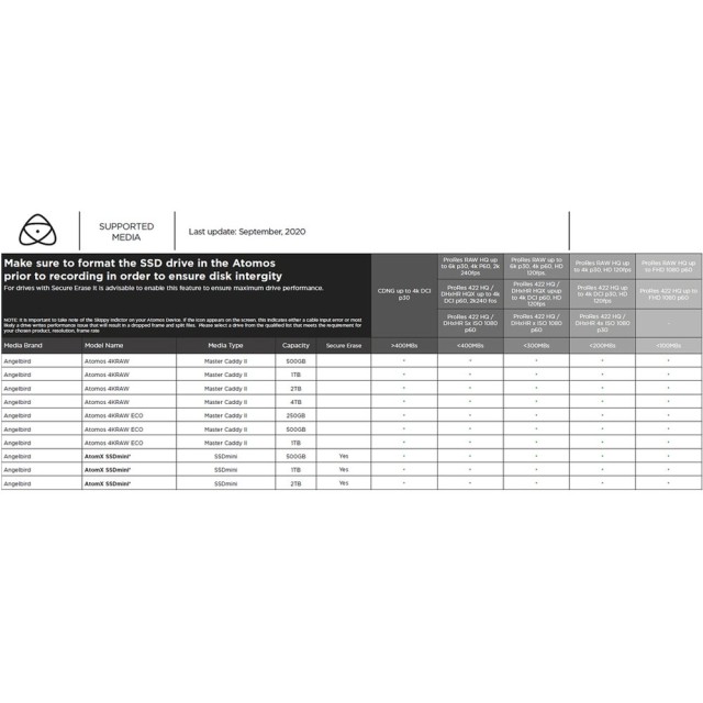 Angelbird’s AtomX SSDmini was custom made for the new Atomos Ninja monitor recorder and is perfectly compatible with all the other available recorders. The AtomX SSDmini is 20 percent smaller than the average SSD (to fit the small footprint of the Ninja), offers 1 TB of storage, has sustained read speeds of 540 MB/s and write speeds of 500 MB/s, captures CDNG up to 4K 30p, ProRes RAW HQ 5.7K up to 30p, plus 4K 60p and 2K 240p, sports a SATA III connector, and supports Stable Stream™ technology to never miss a frame.