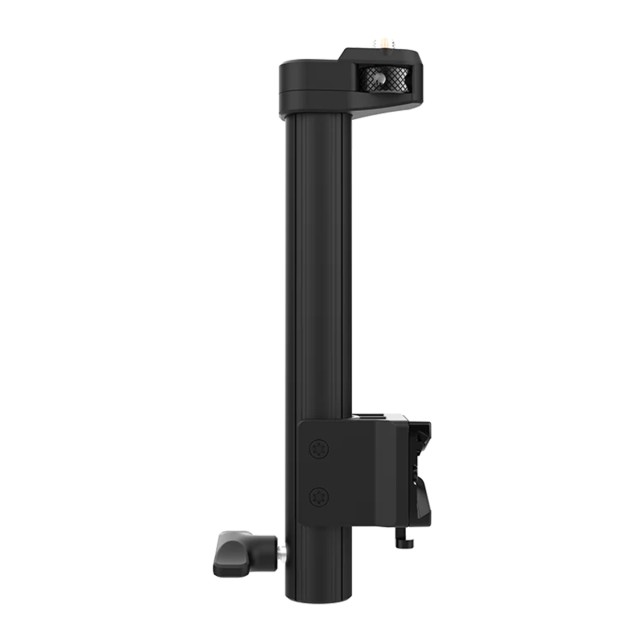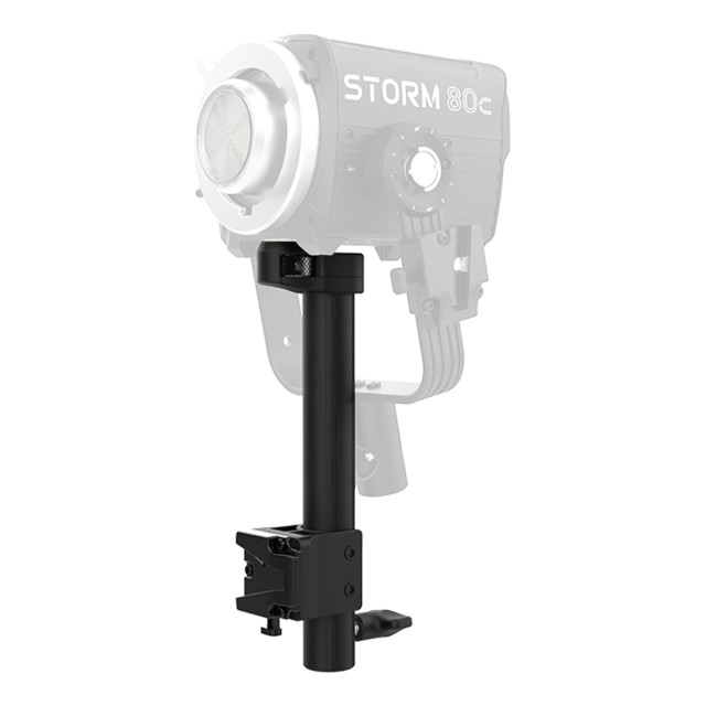 The STORM 80c light holder is attached to the bottom of the light. There is a V-Mount battery plate at the base of the handle for balance. Included is a D-Tap to 5.5mm DC Barrel power cable that connects the battery plate to the STORM 80c. USB-C batteries can also be used to power the STORM 80c. The bottom of the mount includes a baby pin receiver, allowing the light to be attached to the stand even when the detachable yoke is disconnected.