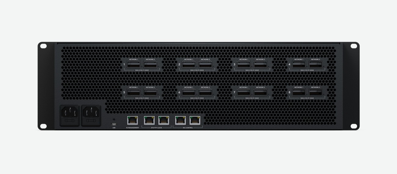 ATEM 4 M/E Constellation IP features multiple SMPTE-2110 connections using 100G Ethernet, supporting 8 input and 8 output video channels on each connection! The switcher then maps inputs and outputs across its multiple 100G Ethernet connections. Each 100G Ethernet connection has two separate connectors, supporting SMPTE-2110 redundancy, so you can connect each port to a separate network switch. SMPTE 2022-7 Seamless Protection Switching sends two identical video and audio copies across connections, then on the receive side, it compares incoming RTP packets by sequence number and reconstructs a perfect video frame from the first arriving packet of pixels. The switcher is totally seamless!