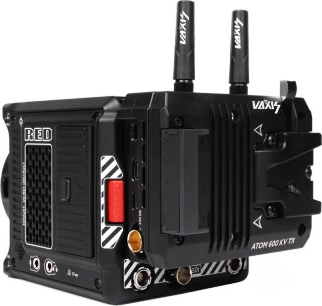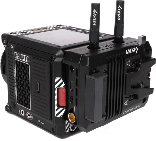 The ATOM 600 KV wireless transmitter and receiver kit from Vaxis is designed for wireless video transmission up to 1080p60 resolution, ideal for RED KOMODO camera monitoring. It enables video transmission with a latency of less than 80 ms over distances up to 180 m in line-of-sight.