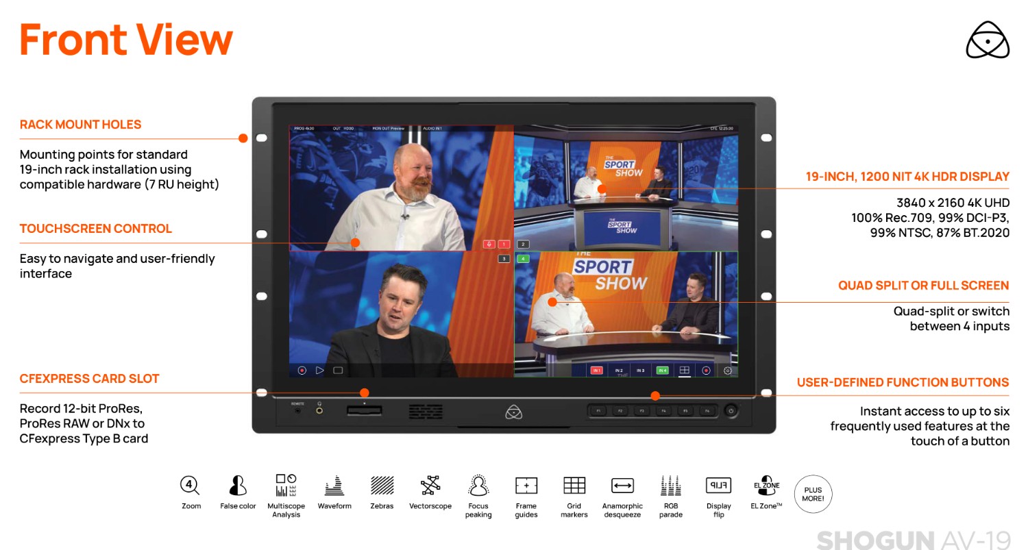 The ATOMOS Shogun AV-19 isa powerful19" 4K HDR DCI-P3 monitor-recorder-switcher designed for professional live production, broadcast, and video village environments.