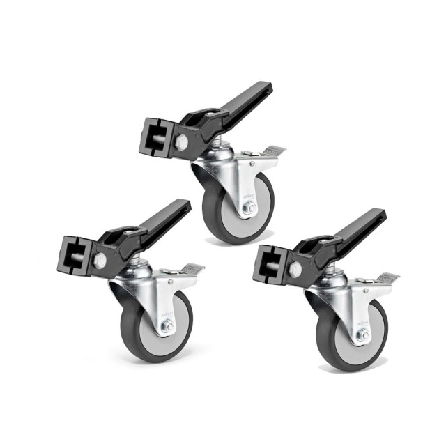 This set of 3 braked wheels are O:100mm and are ideal for 20 x 20 and 25 x 25mm square legs to accessorise stands.