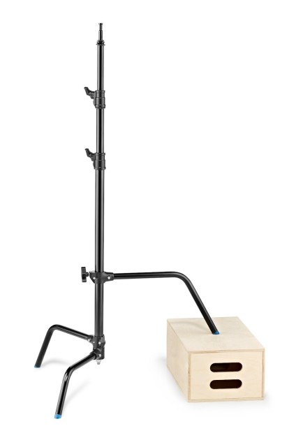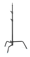 Turtle base chrome plated steel stand in black finish with 3 sections and 2 risers. Legs folds flat for easy storage. This stand has a maximum payload of 10kg and maximum height of 3.28m. It features one sliding leg for easy use on uneven surfaces. The stand is also available in chrome plated steel.