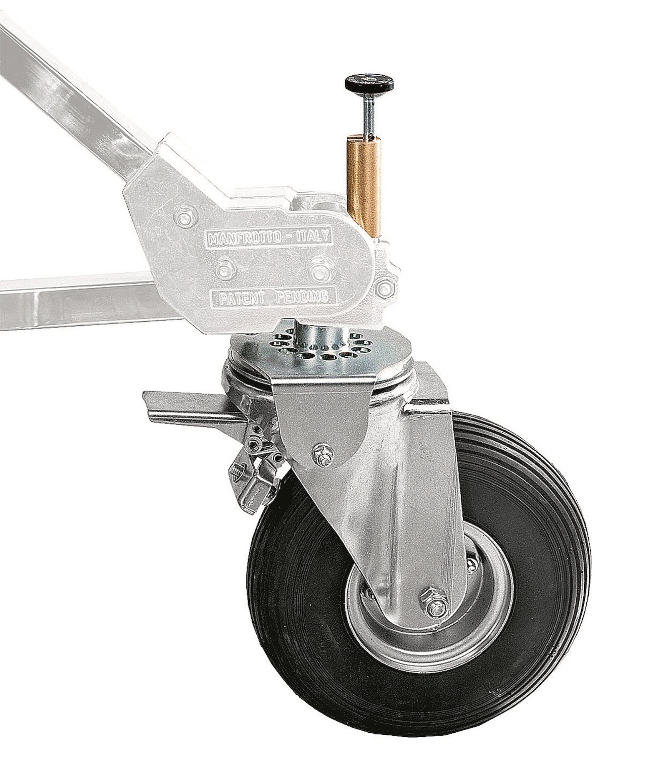 The Avenger B9000P Rubber Fill Wheels Strato Safe set is engineered to provide stable and controlled mobility for Avenger Strato Safe family tripods. This kit includes three robust rubber-filled wheels, each equipped with a dual brake system that independently locks both the wheel rotation and the swivel for maximum safety during operation.