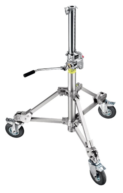 Equipped with foam-filled braked multi-directional wheels, the B7018 allows effortless movement across a variety of surfaces while maintaining precise control over positioning. The stand features a robust gear system with a removable ratchet handle for smooth lifting and lowering of heavy loads. When not in use, the ratchet handle can be conveniently stored on the side of the upper casting attached to the lower column. Its foldable length of 126 cm and a wide base diameter of 120 cm ensure both portability and stability.