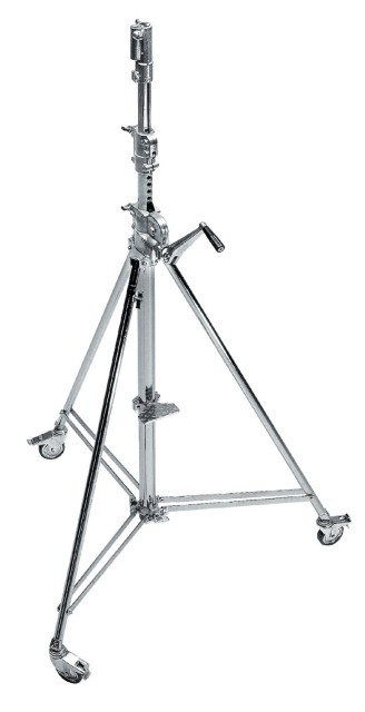 The Avenger B6039CS Wind-Up Stand 39 is a heavy-duty, chrome-plated steel tripod designed for professional photography, film, and studio applications. With a maximum height of 3.83 m, a load capacity of 30 kg, and a leveling leg for uneven terrain, this robust tripod combines precise height adjustment, mobility, and stability for reliable support of cameras, lights, and other equipment.