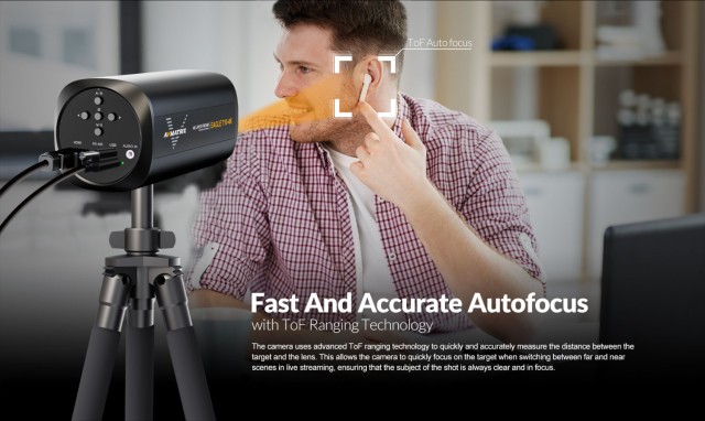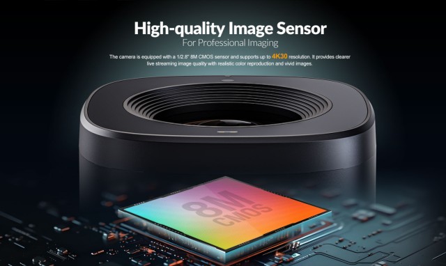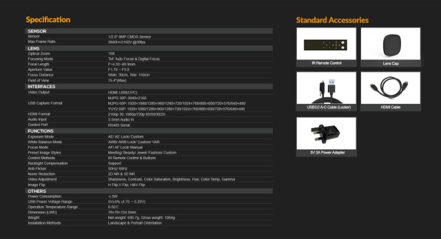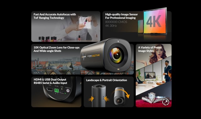 New compact 4K camera with HDMI and USB-C (simultaneous output up to 3840p30) for recording and streaming, integrated wide-angle zoom lens (10x) and 8MP 1/2.8" CMOS sensor.