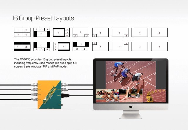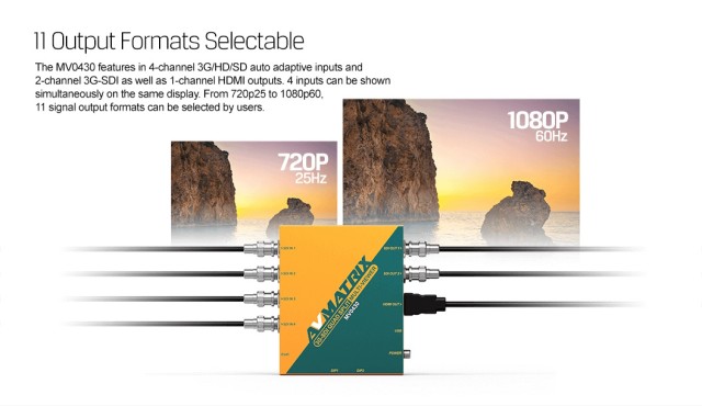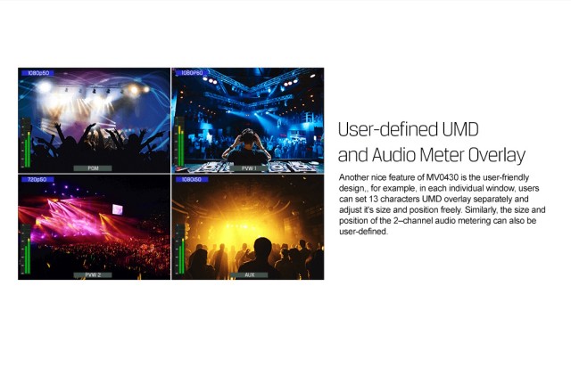 MV0430 is an exquisite and professional SDI multiviewer that features 4-channel 3G/HD/SD-SDI auto adaptive inputs and 2-channel 3G-SDI as well as 1-channel HDMI outputs. Total 16 preset layouts are provided for choices. Users can also adjust the size and position of 11-character UMD and audio meter overlay freely. All the functions can be easily set by a built-in DIP switch, or PC via LAN. MV0430 is your ideal choice for broadcasting and AV post-production applications.