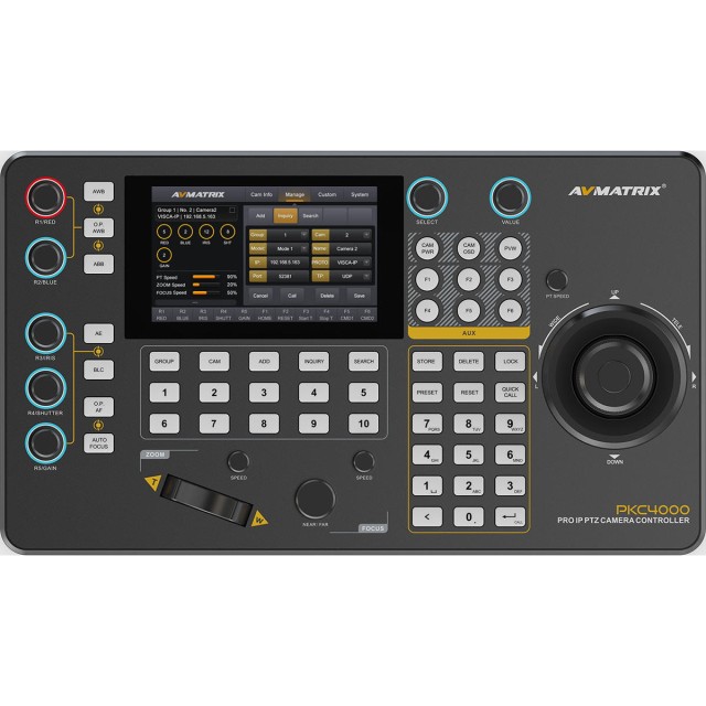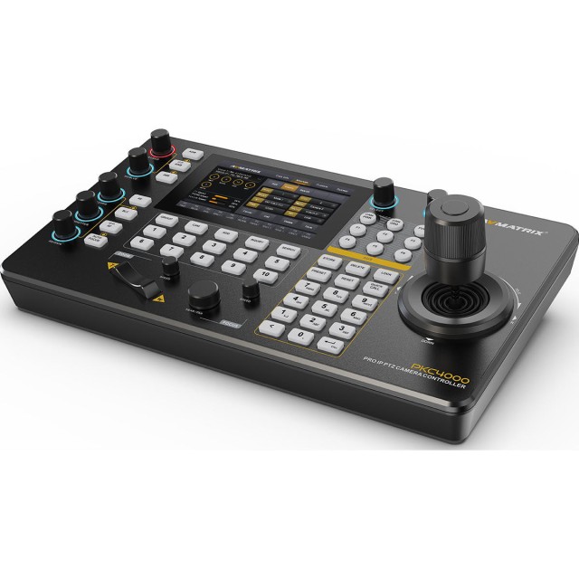 Featuring a 5" touchscreen, 4D joystick, and support for Visca, Pelco P&D, Onvif, and IP protocols, this controller manages up to 100 PTZ cameras with real-time video decoding. Control exposure, iris, focus, and movement with ease. Powered via PoE or 12V DC, it’s ideal for studios, live events, and broadcast environments. NDI version.