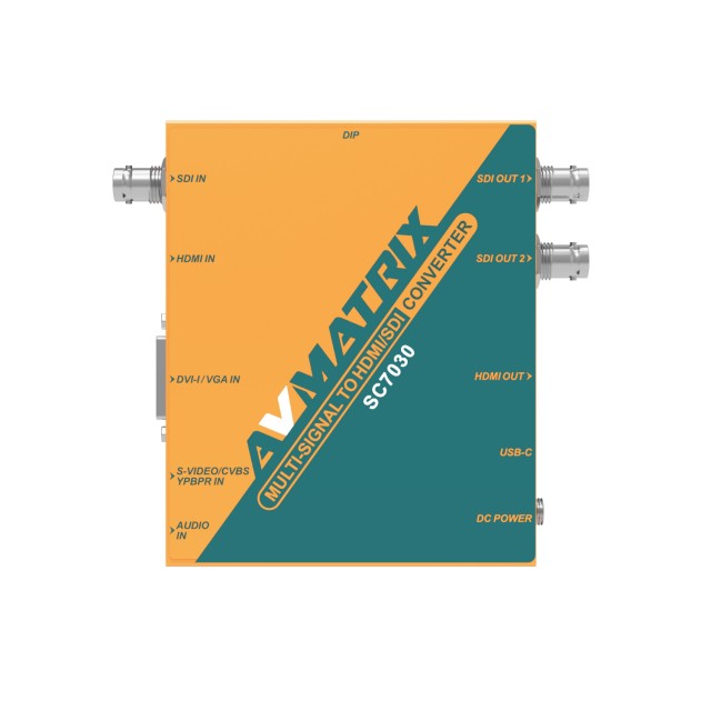 The AvMatrix SC7030 is a high-performance video scaler and converter designed for professional video production and broadcasting. It supports a wide range of input formats, including SDI, HDMI, DVI-I, VGA, CVBS, S-Video, and YPbPr, ensuring broad compatibility. With dual SDI and HDMI outputs, it offers flexible video distribution. The SC7030 provides up/down scaling, frame rate conversion, and aspect ratio adjustments (4:3/16:9), ensuring smooth integration into various workflows. Additional features include analog audio embedding, LED indicators for video and power signals, and easy control via DIP switches or PC software. It is powered via a threaded locking DC 12V or USB-C 5V connection, and an optional detachable bracket allows flexible installation.