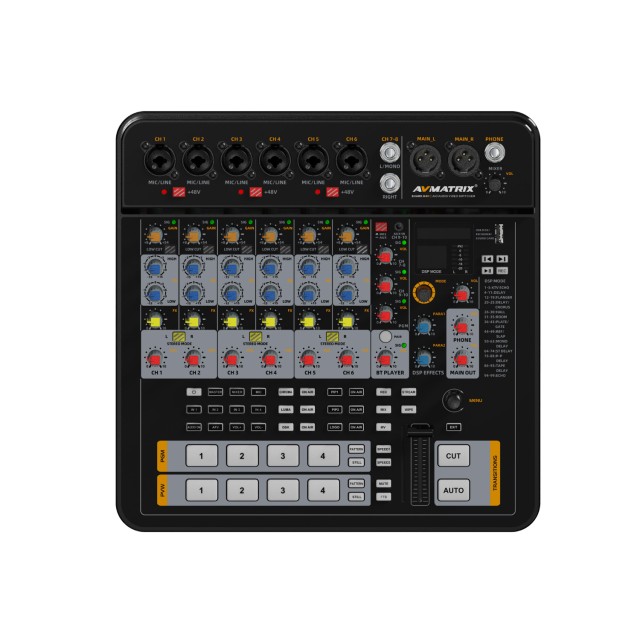 The Shark H4M is a compact yet powerful audio-video switcher designed for professional streaming, broadcasting, and live production. It features six microphone inputs, two stereo inputs, and four-channel embedded audio, delivering high-quality sound with balanced XLR outputs and TRS monitoring. Advanced audio processing includes gain control, a 99-mode DSP effect processor, a mono/stereo switch, and a built-in Bluetooth player.