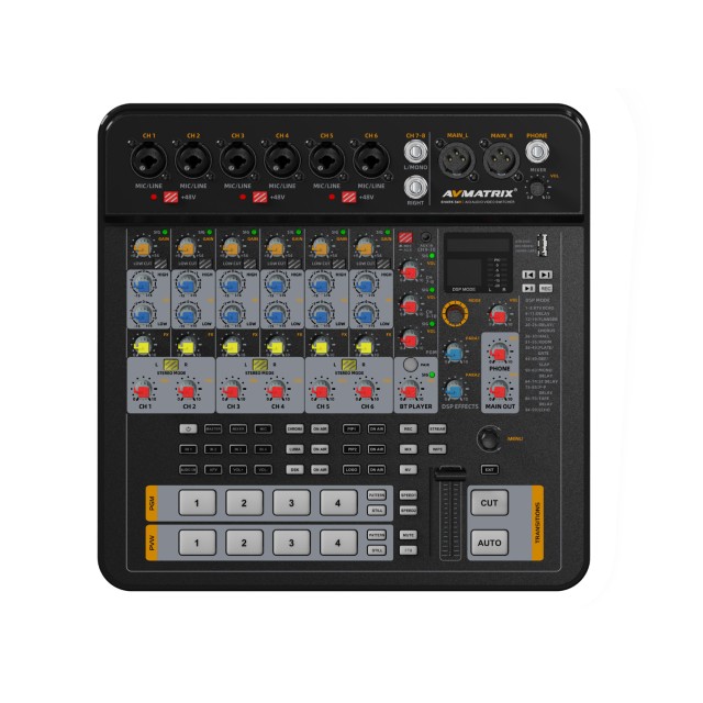The AvMatrix Shark S4M is an all-in-one portable audio-video switcher featuring 6 microphone and 2 stereo inputs, balanced XLR outputs, and advanced DSP effects. With HDMI outputs, USB-C connectivity, streaming support, and integrated recording, it's the perfect solution for live production and broadcasting.