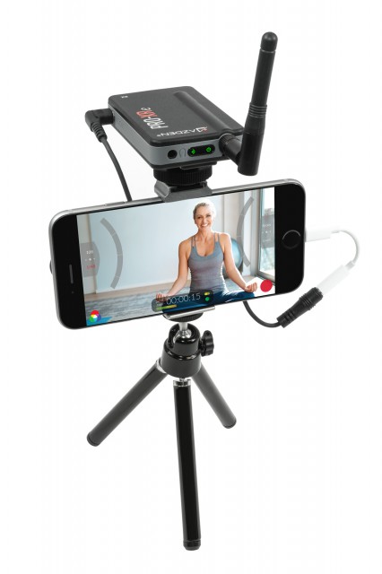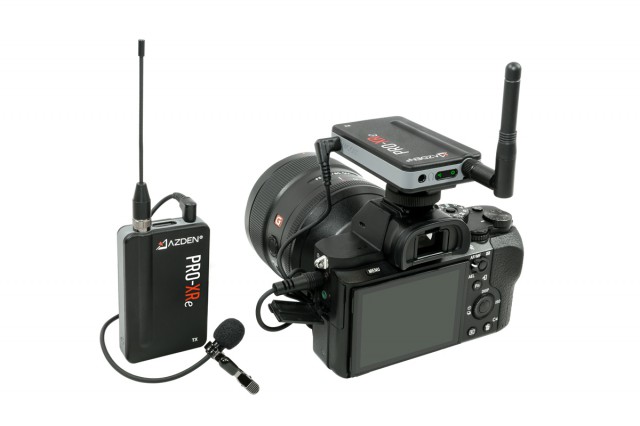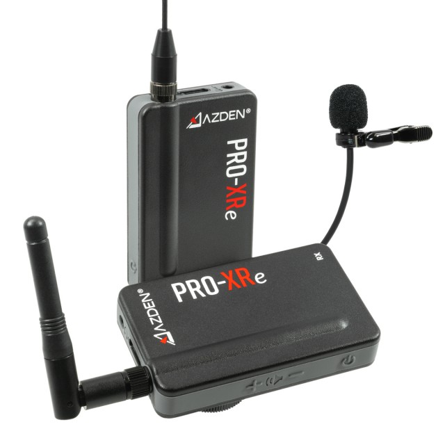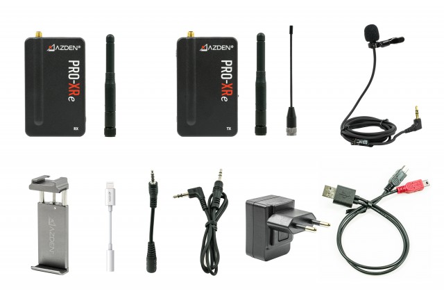 Azden PRO-XRe 2.4GHz digital wireless mic system w/ signal redundancy technology, range up to 350' in optimal conditions, 20hr battery life, TRRS & 3.5mm-to-Lightning cables included, plus phone mount and dual-mini-USB charger