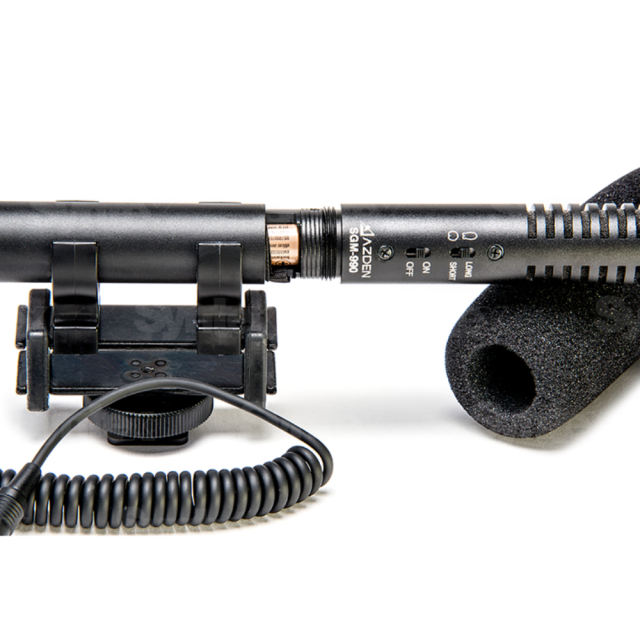 Azden SGM-990+i2-position (Supercardioid/Omni) shotgun mic with 3.5mm TRS plug output cable. Includes shock mount holder, foam windscreen & TRRS mobile device interface cable