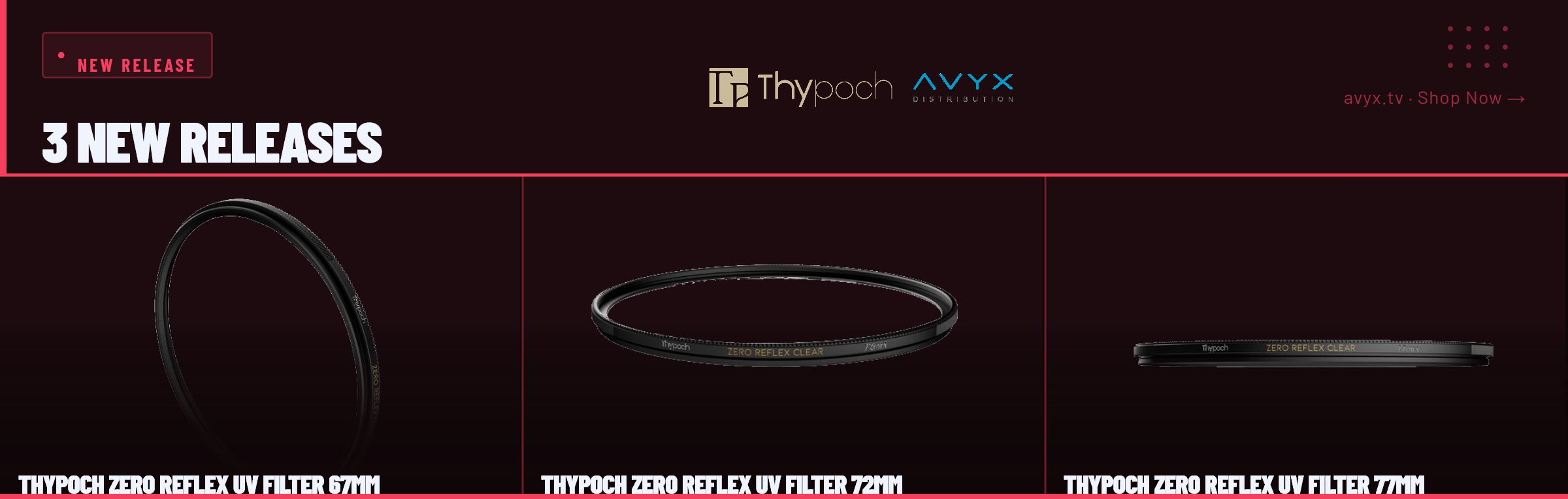 Introducing the complete Thypoch Zero Reflex UV Filter lineup, now available in 67mm, 72mm, and 77mm thread sizes. Each filter features advanced multi-layer coating technology that minimizes reflections and flare while ensuring maximum light transmission and exceptional optical clarity. Designed to protect your valuable lenses from dust, scratches, and fingerprints, these filters maintain superior image quality across all shooting conditions. Whether you're shooting landscapes, portraits, or street photography, the Thypoch Zero Reflex series keeps your images sharp and true to life. Available now at avyx.tv