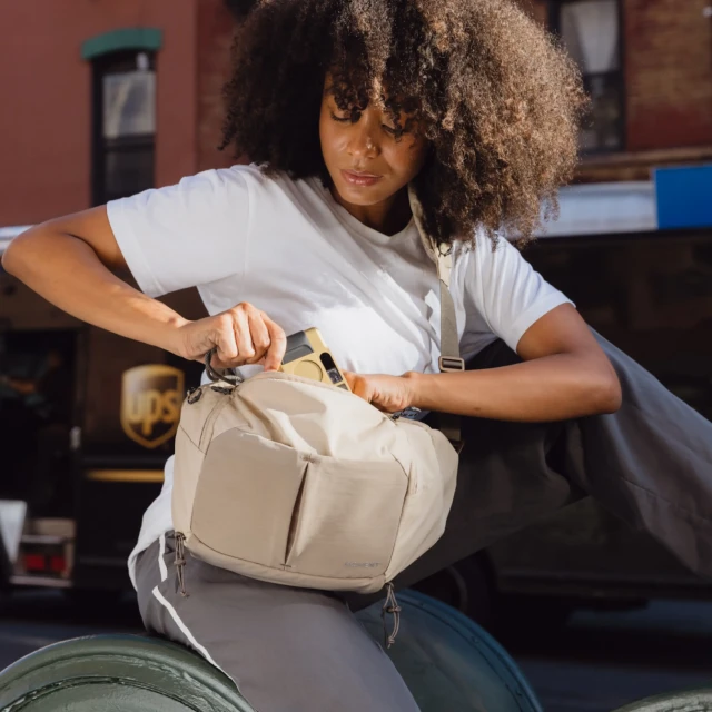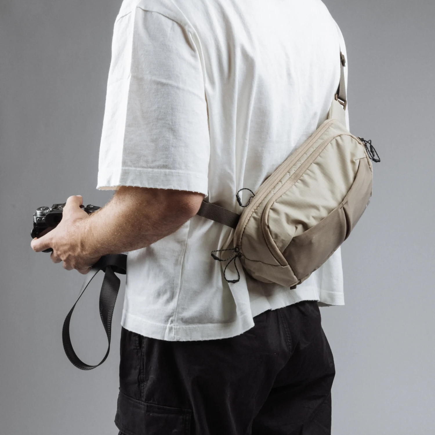 A distinctive zippered shoulder pocket transforms the bag's main strap into a functional padded pocket system, giving you instant access to essentials such as your phone, filters, wallet, or AirPods. The bag is spacious enough for a full-size camera with a telephoto lens and a tablet, yet small enough to keep up with the rest of your team.