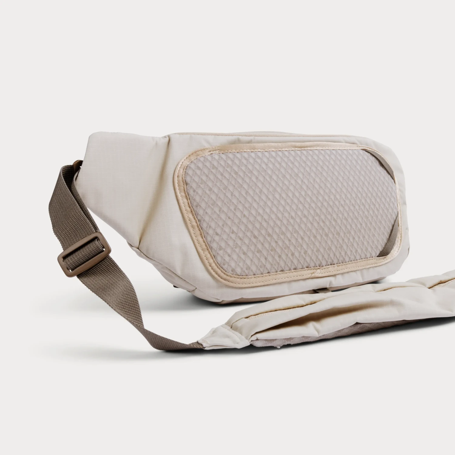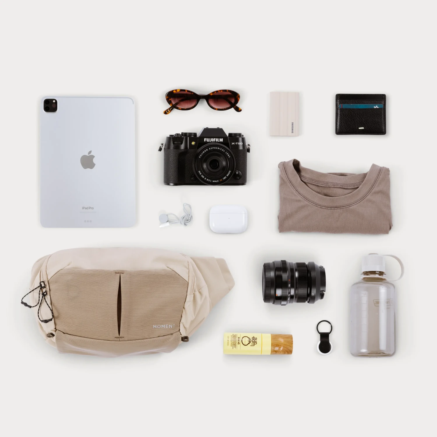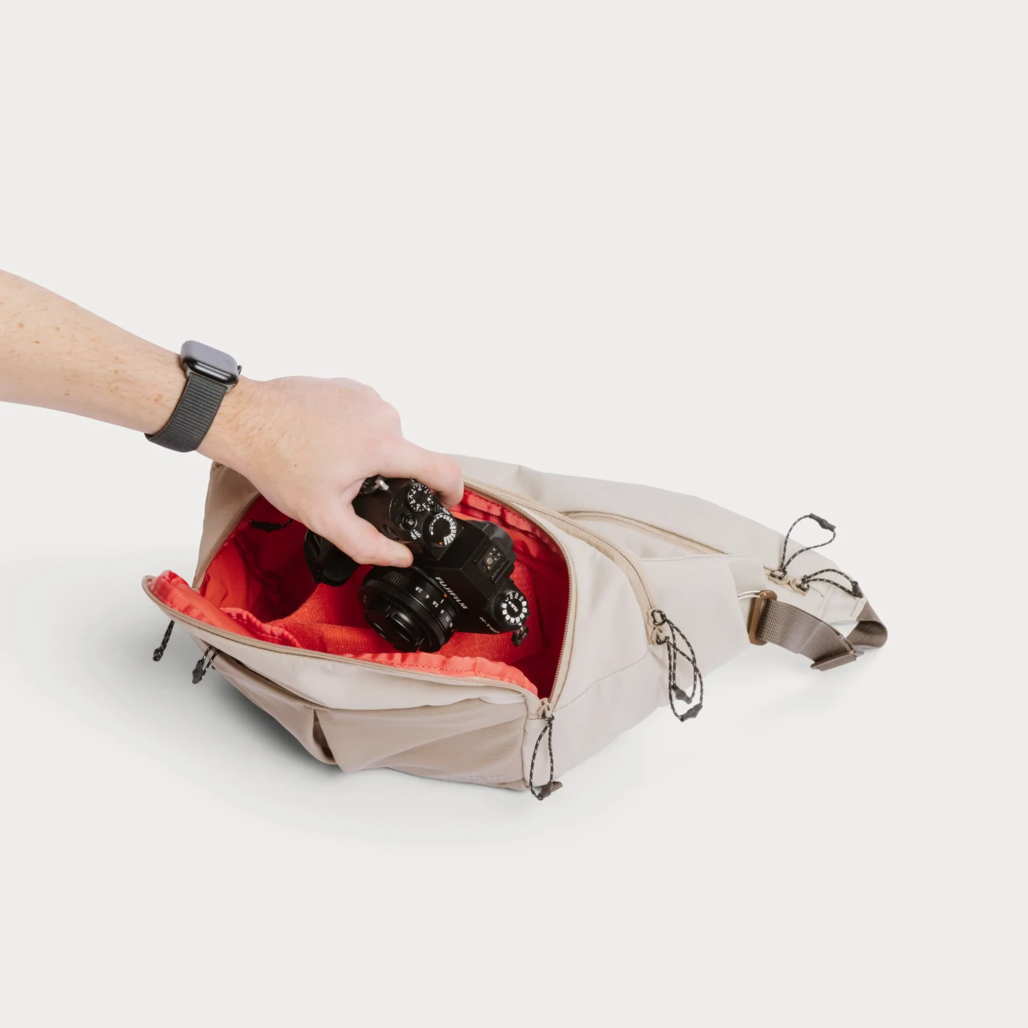 A bandolier pocket with light padding and a separate clip is built into the strap to keep your phone, keys, AirPods, or mobile lenses close at hand.