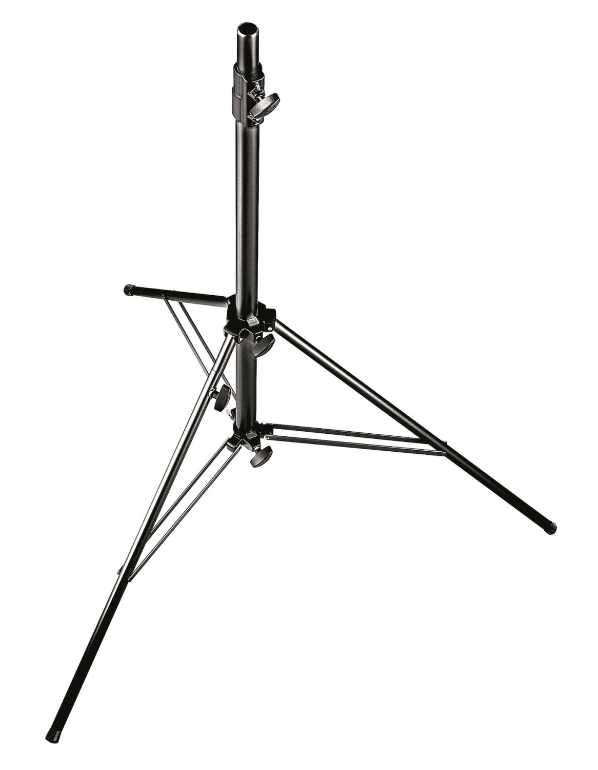 The Manfrotto 126BMUAC Black Air-Cushioned Levelling Leg LE Stand is a 2.87 kg aluminum 2-section (1-riser) light stand extending 106–218 cm with 30 kg payload (10 kg at max extension), air-cushioned risers, double-braced legs, one levelling leg, and 35 mm male spigot—delivering rock-solid, speaker-ready stability for studio or location lighting.