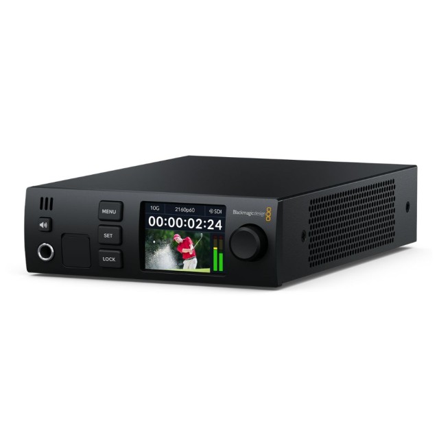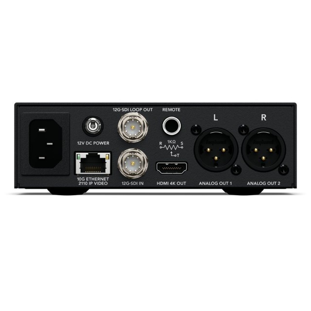This model has been designed to enable the use of the latest OLED TVs for accurate colour monitoring, for example in colour grading and editing rooms. The Blackmagic 2110 IP SDI to HDMI 12G includes two channels of XLR analog audio output for monitoring, allowing remote volume control and custom delay settings for connecting active speakers. It includes variable gain and delay for perfect AV synchronization and 3D LUTs for accurate color calibration of HDMI displays. The unit has a front LCD display with video preview, audio levels and menus, as well as a speaker and headphone output.