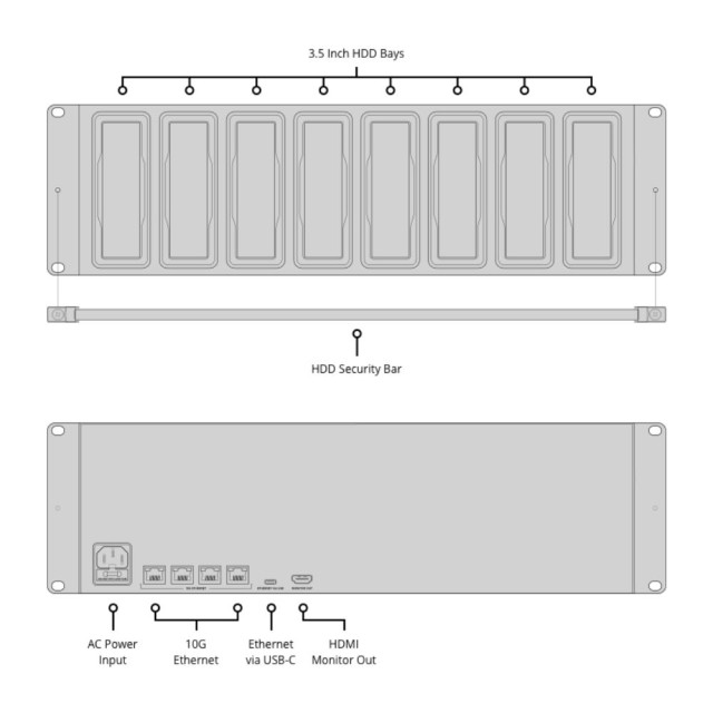 With Blackmagic Cloud support, files can be synced globally so you can back up projects you're working on in DaVinci Resolve. You can monitor all storage, connection and sync activity in real-time on a display connected via HDMI monitoring output. Blackmagic Cloud Backup 8 includes 4 10G Ethernet ports for network sharing, an Ethernet port via USB-C and a built-in power supply - all in a sleek rack-mountable design.