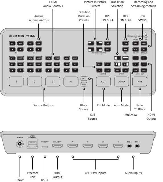 ATEM Mini features a compact control panel based design with all video, audio and control connections on the rear panel. The front panel includes easy to use buttons for selecting sources, adjusting audio inputs, as well as selecting video effects and transitions. The rear panel includes HDMI inputs for connecting cameras or computers, plus additional microphone inputs. The ATEM Mini program is output via an HDMI video out as well as a USB for webcam output. The front panel buttons are large and easy to use by feel, so its even possible to use the switcher while presenting. Customers also get audio mixer buttons for live audio mixing.