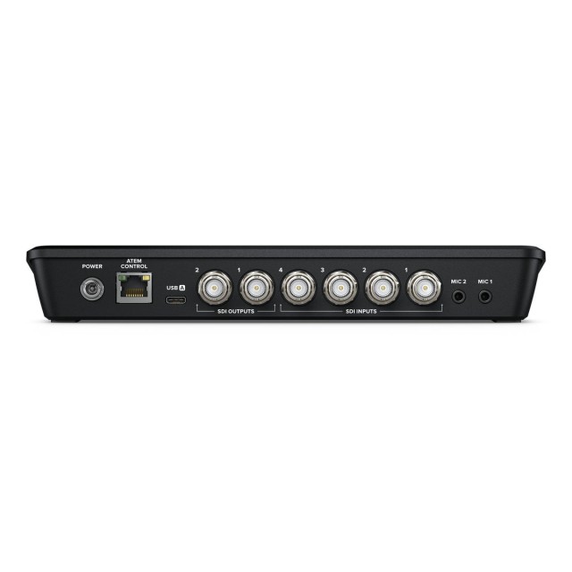 ATEM SDI’s compact all in one design includes both a control panel as well as connections. The front panel includes easy to use buttons for selecting sources, video effects and transitions. The source buttons are large so it’s possible to use it by feel, letting the presenter do the switching. Customers even get buttons for audio mixing. The ATEM SDI Pro and Extreme models have buttons for recording and streaming control, as well as output selection buttons that let customers change the video output between program, direct camera feeds and the multiview. On the rear panel there are SDI connections for cameras, extra microphone inputs, USB for webcam plus multiple SDI "aux" outputs for program video.