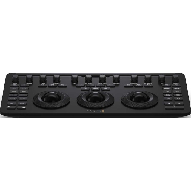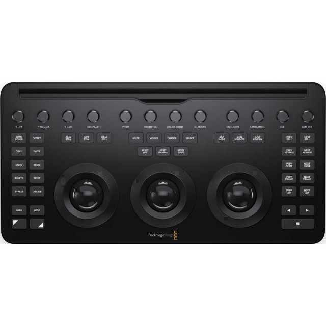 The new DaVinci Resolve Micro Color Panel features 3 high resolution weighted trackballs and 12 precision machined control knobs which give direct access to the most powerful primary correction features, making it easy to experiment and try new combinations. The primary knobs can be used to control Y Lift, Y Gamma, Y Gain, Contrast, Pivot, Mid-tone Detail, Color Boost, Shadow, Highlight, Saturation, Hue Rotation and Luminance Mix.