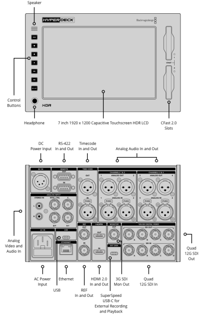 HyperDeck Extreme 8K features a wide range of video and audio connections such as multi-rate Quad Link 12G-SDI for SD, HD, Ultra HD and 8K SDI devices. The 12G-SDI outputs support fill and key when playing RGBA 4:4:4:4 files. HDMI is included for consumer televisions and video projectors. For archiving work, HyperDeck also includes both balanced analog, HiFi audio plus timecode connections. For monitoring there's even a down converted monitor SDI output that includes overlays. The latest 10G Ethernet is included for high speed upload using FTP protocols.