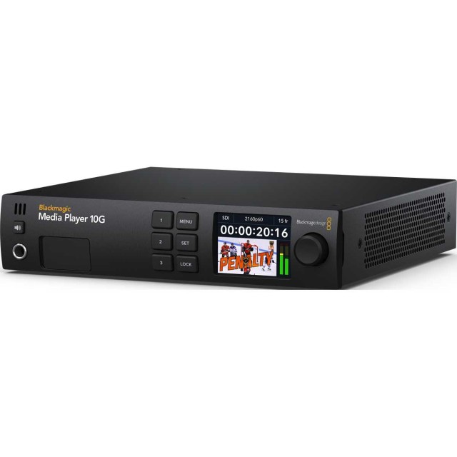 Blackmagic Media Player includes everything customers need for broadcast playback. Place it on the desktop or it can be rack mounted using a Blackmagic Universal Rack Shelf. The front panel has an LCD with video, audio meter status information that includes input, video standard and the depth of the record/playback frame buffer. The audio meter can also be changed between VU and PPM. There's also a headphone socket, speaker and a speaker enable button.