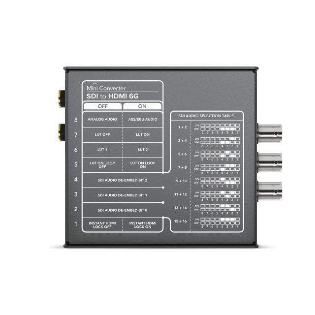 Mini Converter SDI to HDMI 6G also includes a full 33 point 3D lookup table for extremely high precision, feature film quality color conversions. That means LUTs can be applied to create custom looks, color and gamma changes in realtime while monitoring on set. This also means that customers can use Mini Converter SDI to HDMI 6G as a 3D LUT processor. 3D LUTs are also compatible with DaVinci Resolve, so customers can use the same LUTs on set and in post for consistent color.