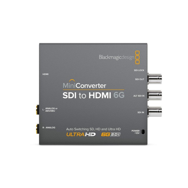 The Mini Converter SDI to HDMI 6G and Mini Converter HDMI to SDI 6G models make it possible to convert SDI to HDMI or HDMI to SDI in all formats up to 2160p30. Both models feature professional multi rate 6G‑SDI and are compatible with all existing SDI broadcast equipment. They also feature HDMI along with analog and AES/EBU audio inputs or outputs, depending on the model. The SDI to HDMI 6G model also includes HDMI instant lock and 33 point 3D LUT support, which are new advanced features that were not available in previous models.