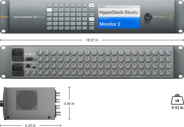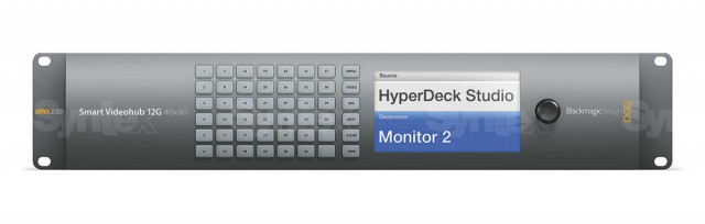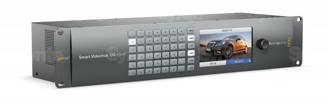 In addition to its advanced 12G-SDI connections, Blackmagic Smart Videohub 12G 40x40 includes full front panel controls, dual built in power supplies for redundant power and increased reliability, external ethernet control, RS422, and support for tri-sync and black burst reference. The router can also be controlled remotely via Ethernet using Blackmagic Design router control software for Mac OS X and Windows, or with the Blackmagic Smart Control and Master Control hardware router control panels.