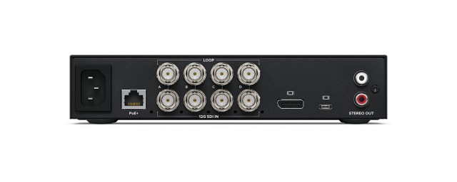 The front panel includes controls and a color display for input video, audio meters and the video standard indicator. The rear panel has Quad Link 12G-SDI for HD, Ultra HD as well as 8K formats. There's 2 DisplayPort connections for regular computer monitors or USB-C style DisplayPort monitors such as the new Pro Display XDR. The built in scaler will ensure the video input standard is scaled to the native resolution of the connected DisplayPort monitor. Customers can even connect both 2SI or Square Division inputs.