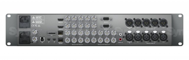 Designed to be used on a desktop, or installed into equipment racks, UltraStudio 4K Extreme features an attractive, machined aluminum front panel with an integrated color display and buttons for quickly selecting input sources for video, audio, timecode and deck control. The rear panel includes virtually every type of video and audio connection that exists, including 12G-SDI, HDMI 2.0, analog component and composite video, balanced XLR and AES/EBU digital audio, as well as optical fiber expansion cages, RS-422 deck control inputs, dual power supplies and more.