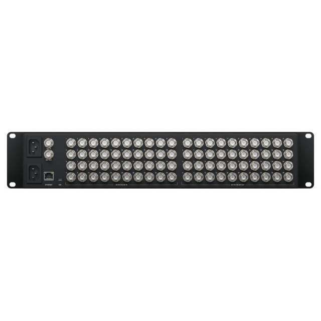 All models of Blackmagic Videohub 12G feature advanced 12G-SDI connections which are multi rate so they support any SD, HD and Ultra HD video format up to 2160p60 and will connect to any SD, HD-SDI, 3G-SDI, 6G-SDI and 12G-SDI equipment. Plus Blackmagic Videohub 12G also supports routing any video standard on the same router at the same time. That means on the 40x40 model customers could route up to 40 different video standards at the same time. 12G-SDI gives customers high frame rate Ultra HD via a single BNC connection that also plugs into all of their regular HD equipment. With 12G-SDI customers get a future proof technology that connects to the equipment customers have now and in the future.