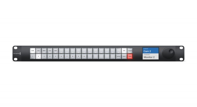 Ethernet hardware panel with spin knob control. The Videohub Master Control Pro is a remote 1RU panel that gives you complete control over your entire router from anywhere in the studio. Simply connect Master Control Pro to your ethernet network and you get full control of every crosspoint on your router. The front panel features programmable buttons, spin knob control and an elegant LCD for displaying source and destination labels. That means you can see and route all of your cross-points remotely, even on the biggest Videohub! 11/2019.