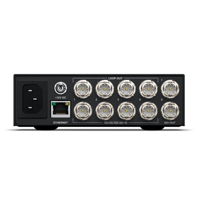A front panel control panel allows for quick video signal routing, and also includes an emergency 12G-SDI input for connecting external equipment and a USB-C output for use as a webcam. The device also supports SDI signal re-clocking and remote control via Ethernet.