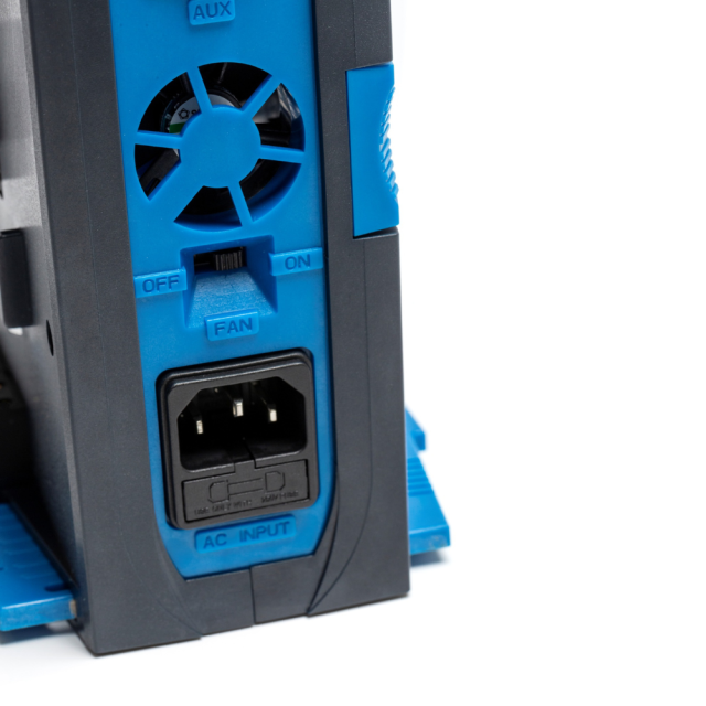 Simultaneous charge, up to 2 installable batteries, retractable Foot design, On/Off switchable fan, DC-UPS - Uninterrupted AUX power