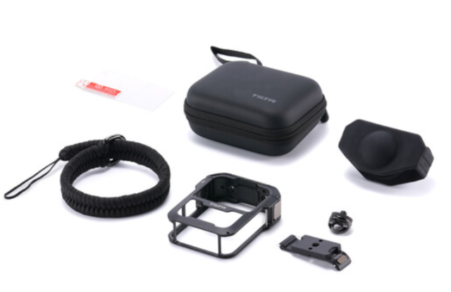 The Tilta TA-T89-A-B Camera Cage Horizontal Mounting Kit is a lightweight, black magnesium-aluminum protective cage tailored for the DJI Osmo 360 action camera, offering full port and battery access, a quick tool-less install, cold shoe and anti-twist 1/4"-20 mounts, a horizontal orientation plate, wrist-strap slot and an included silicone lens protector.