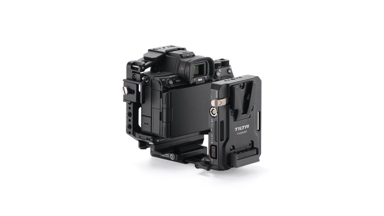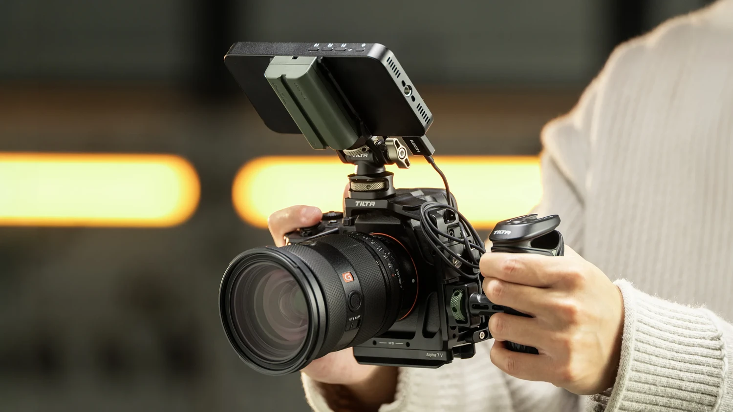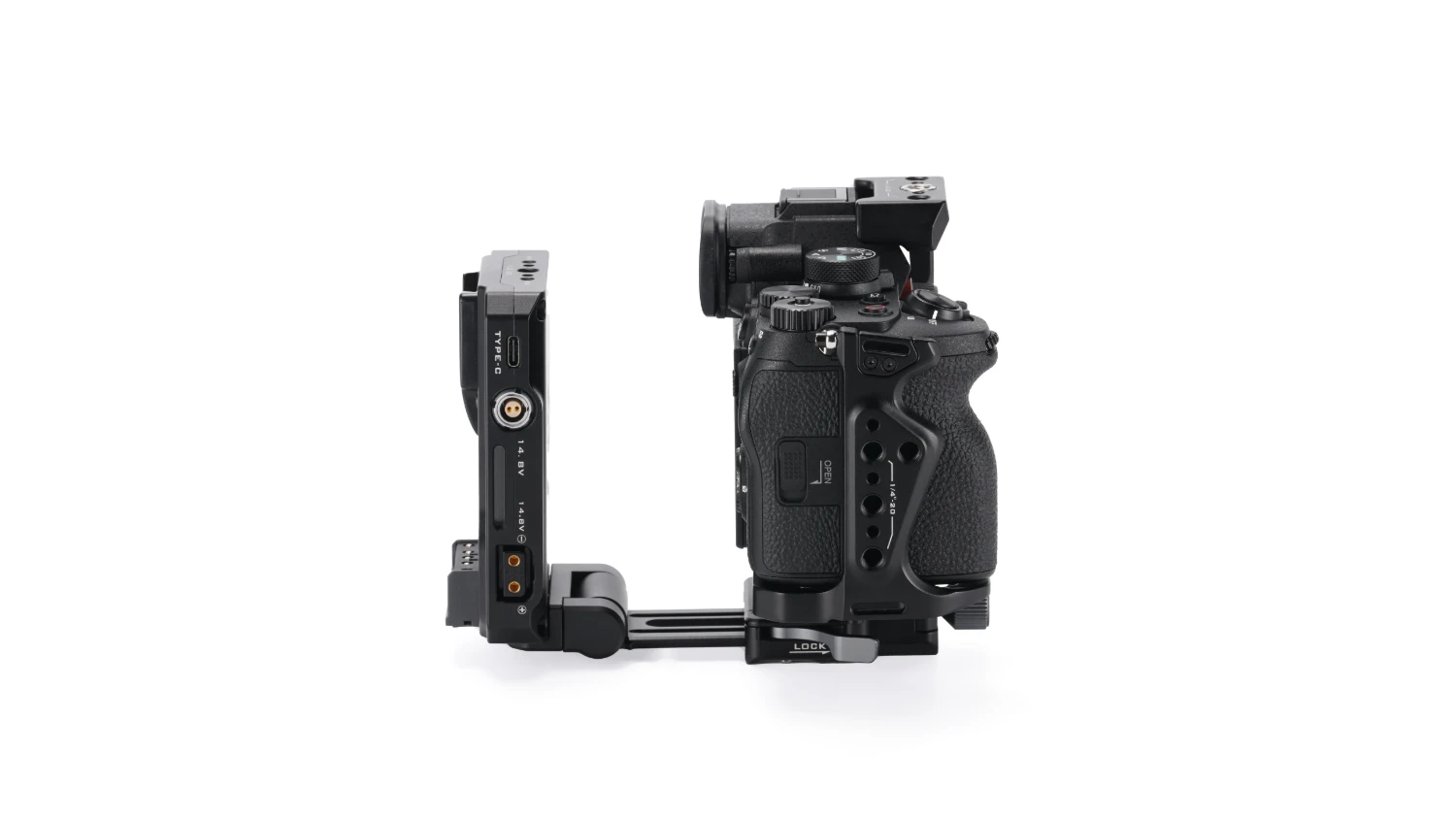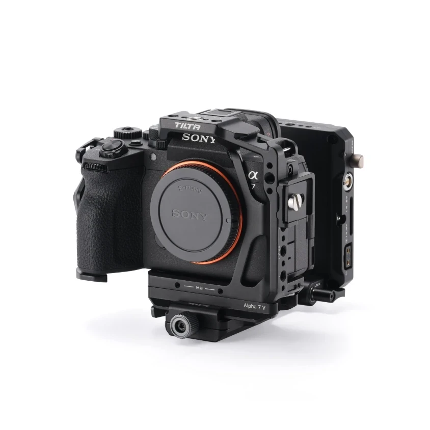 The precisely designed construction provides sufficient space and preserves the natural ergonomics of the camera without blocking buttons, battery compartment, original flashes, microphone handles, or lens adapters. The package also includes a cable clamp that helps secure loose cables and ensures stable signal transmission via HDMI cables (compatible with Sony α7V, α7IV, and α7R V).